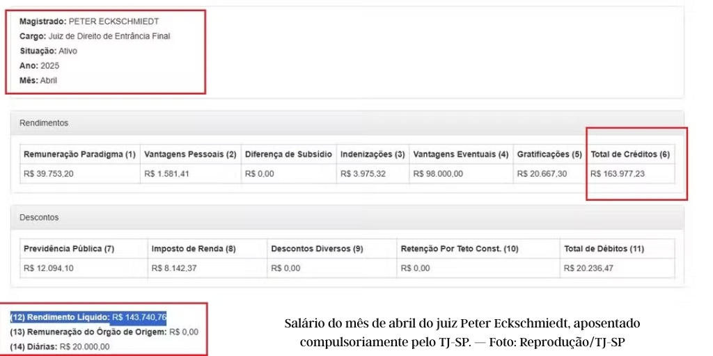 De acordo com o portal de transparência do TJ, em abril o juiz recebeu R$ 143 mil líquidos. Atualmente, recebe vencimentos proporcionais ao tempo de serviço.