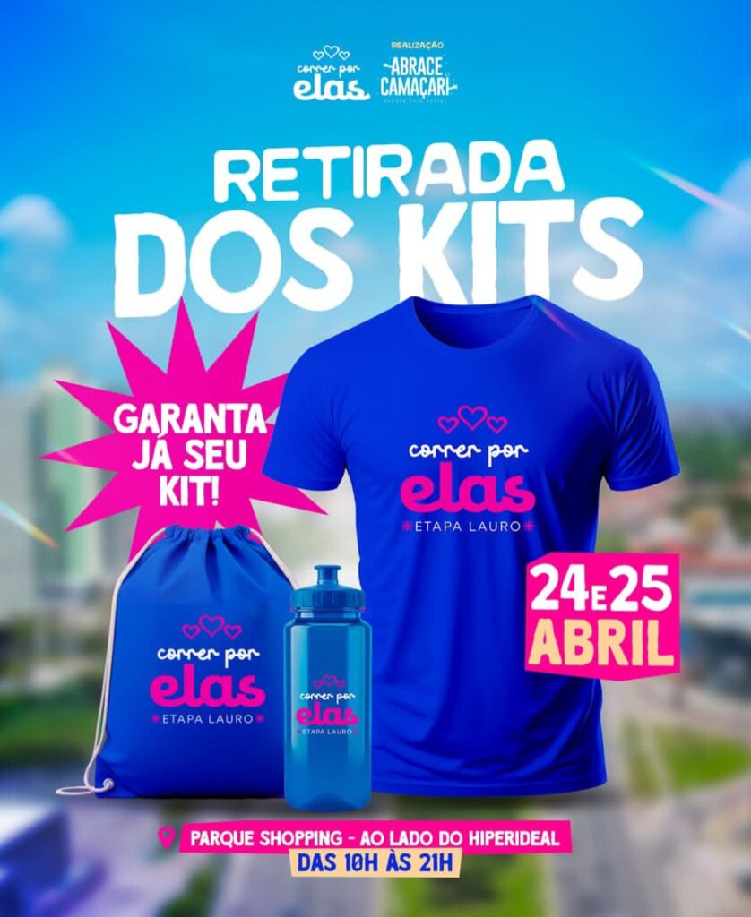 Os atletas inscritos na 2ª edição da corrida solidária “Correr por Elas”, em Lauro de Freitas, que será realizada neste domingo (26/4), poderão retirar o kit da corrida nos dias 24 e 25 de abril, das 10h às 21h, no 1º piso do Parque Shopping Bahia, em loja próxima ao Hiperideal.